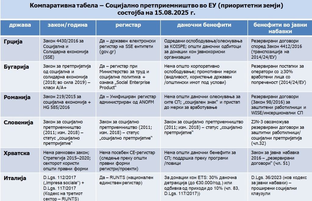 Целосни законски решенија со решен статус на социјалните претпријатија имаат постарите членки на Унијата – Франција, Шпанија, Португалија, Грција и Италија, но и поновите Романија, Словенија, Словачка, Бугарија и Полска. Во Германија, Холандија, Данска и Шведска иако не е донесен посебен закон за социјално прептиемништво, постојат силни екосистеми, а поддршката се обезбедува преку програми, даночни режими за непрофитни организации и јавни набавки. Во Хрватска нема рамковен закон, но постои национална стратегија, а Владата и нејзините национални агенции развија одредени шеми за финансирање како што се гаранции за кредити за мали и средни претпријатија, шеми за грантови за поддршка на иновациите и субвенции за вработување за поддршка на мерките за инклузија.