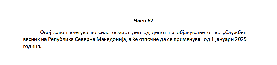 Во последниот, член 62 на предлог-законот е наведен и датумот од кога треба да почне неговата примена: